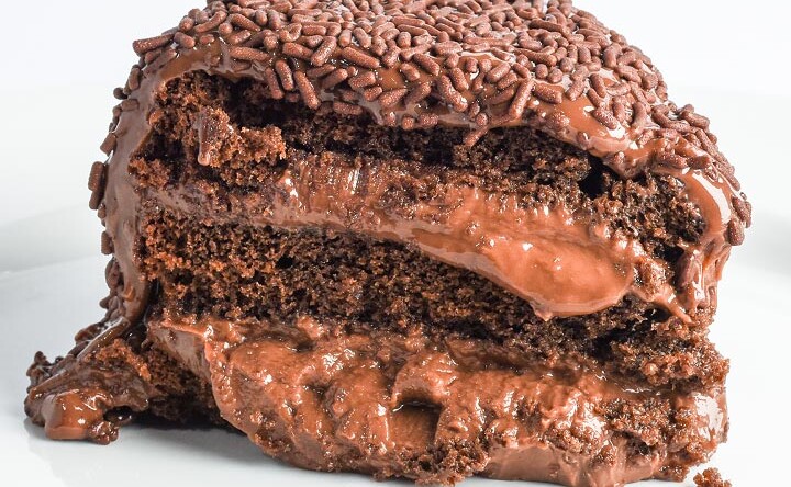 Decadent chocolate cake, rich Brazilian Brigadeiro chocolate filling, chocolate sprinkles