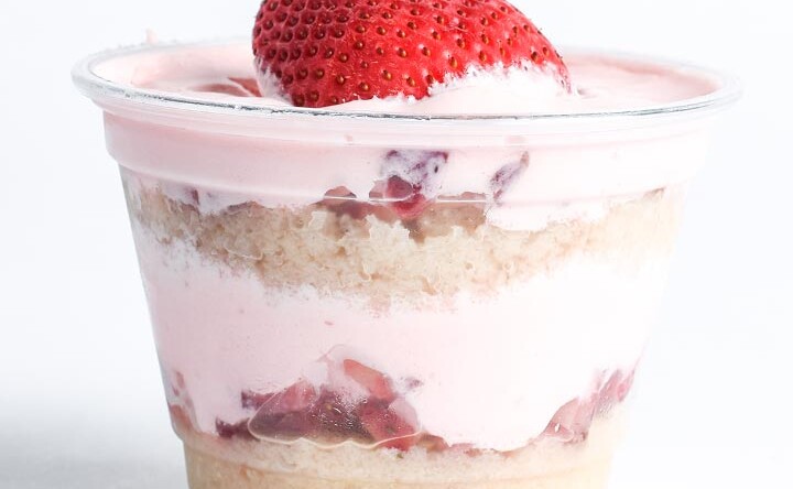 Decadent vanilla cake, rich strawberry mousse, fresh strawberries.