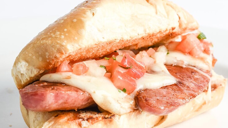 French bun, calabrese sausage, tomato-cilantro salsa, garlic sauce, mozzarella cheese.