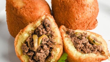 Seasoned, deep-fried dough, ground sirloin & picanha blend steak.