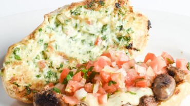 Garlic bread, chicken hearts, mozzarella cheese, tomato-cilantro salsa.